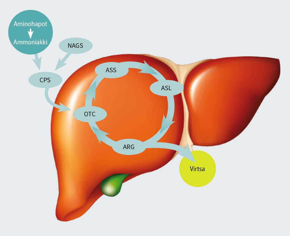 Kun elimistö sulattaa proteiinia se hajoaa aminohapoiksi. Jotkut näistä muuttuvat myrkyllisiseksi ammoniakiksi, joka muunnetaan maksassa myrkyttömäksi kemikaaliksi (urea). Tämä tehdään ureasyklinä tunnetulla prosessilla. Ureasyklissä tapahtuu useita vaiheita, joista jokainen vaatii entsyymin toimiakseen.